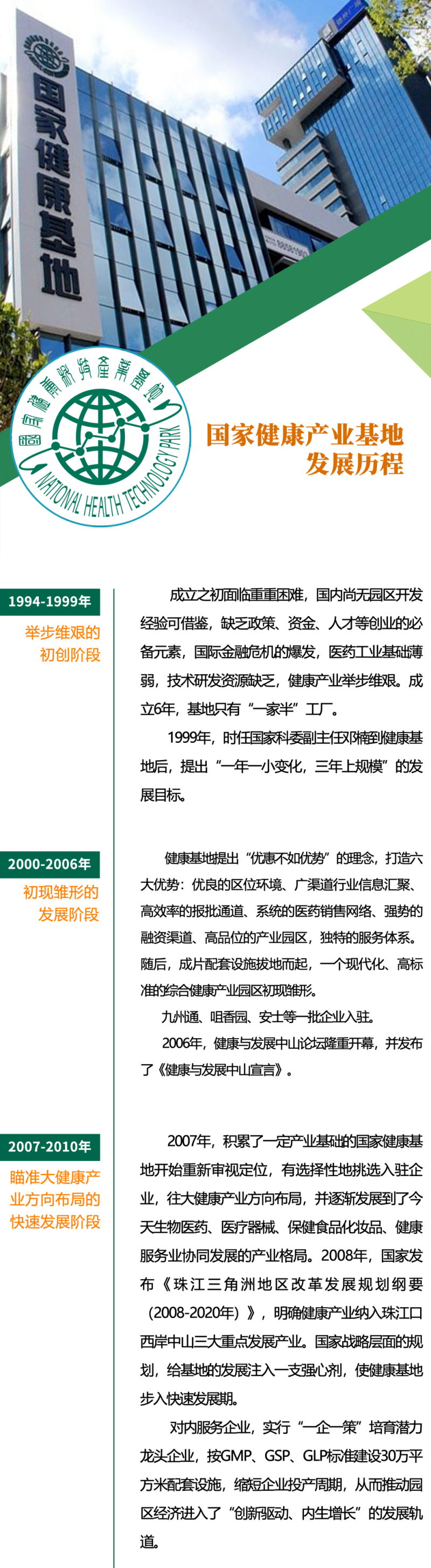 1992年1月,中美兩國在華盛頓聯(lián)合簽署了《關(guān)于知識產(chǎn)權(quán)保護(hù)的諒解備忘錄》。國際環(huán)境的變化,要求中國必須擁有具有自主知識產(chǎn)權(quán)的創(chuàng)新藥物,否則必將在未來的經(jīng)濟(jì)角力中吃虧。而這也同時意味著,在中國建設(shè)一個按照國際創(chuàng)新藥物標(biāo)準(zhǔn)的新藥研究、開發(fā)和生產(chǎn)基地,顯得迫切而重要。有山有水有碼頭、離港澳近的中山贏得了這次機(jī)會。1994年,時任國家科技部副部長鄧楠、廣東省副省長盧鐘鶴、中山市市長湯炳權(quán)分別代表國家科委、廣東省人民政府和中山市人民政府,在中山正式簽署協(xié)議,由三方共建當(dāng)時國內(nèi)唯一的國家級健康科技產(chǎn)業(yè)基地,這標(biāo)志著中國的自主新藥研發(fā)和產(chǎn)業(yè)化從此在健康基地邁入征途。